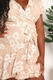 This dress features a surplice neckline, adding a touch of elegance and allure. The floral lace and pompom details add a feminine and playful element to the dress. With its tie-waist feature, it accentuates your figure and provides a flattering fit. The short flutter sleeves add a romantic and whimsical touch. This mini dress is perfect for a special occasion or a night out, allowing you to look effortlessly chic and stylish.